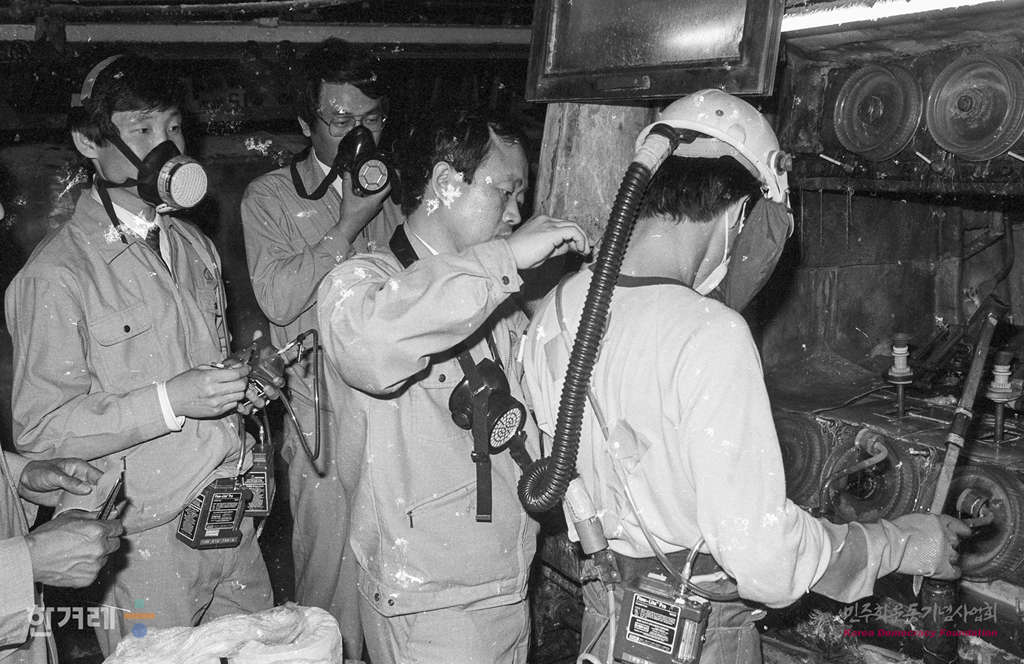 - 1991년 4월 26일 이황화탄소 중독환자가 잇따라 발생으로 물의를 빚고 있는 가운데 노동부 특별점검반이 원진레이온의 방사과 한 노동자의 몸에 유해가스 노출도를 측정하기 위해 계기를 붙이고 있다.