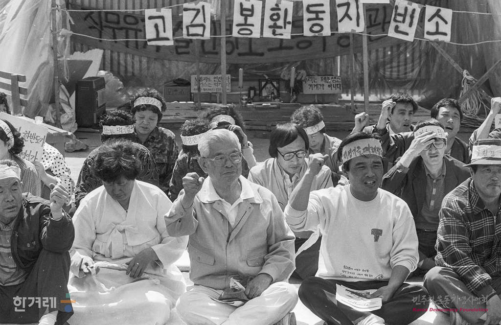 - 1991년 4월 26일 이황화탄소 중독환자가 잇따라 발생으로 물의를 빚고 있는 가운데 공장에서 노동ㅂ 특별점검반이 작업환경을 점검하는 사이 새로 이황환탄소 중독자로 판명된 원진레이온 노동자들이 지난 1월 5일 사망한 뒤 회사 정문앞에 마련된 고 김봉환씨의 빈소앞에서 시민단체 회원들이 농성을 벌이고 있다.