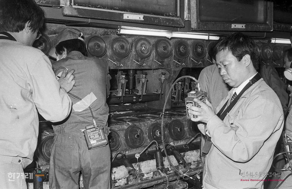 - 1991년 4월 26일 노동부 특별점검반이 원진레이온 현장을 조사하고 있다. 노동부는 88년 8월 원진레이온에 대해 실시한 특별근로감독때 유해물질 취급 노동자들에게 당시 1년에 한번식 하도록 돼 있는 특수건강진단을 3년간 한번도 실시하지 않았다.