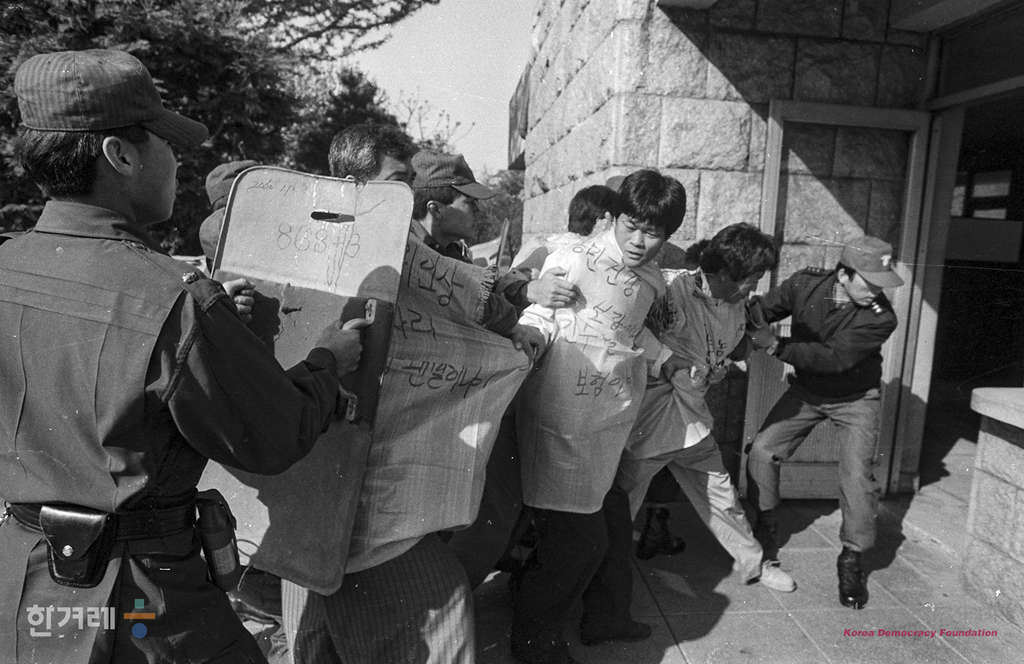 - 1991년 4월 26일 전국농민회총연맹 소속 농민들이 서울 여의도 국회의사당입구에서 쌀값보장을 요구하며 국회에 집입하려다 경찰에 의해 연행되고 있다.