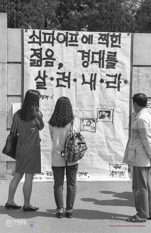 - 1991년 4월 27일 명지대생 강경대씨가 시위진압과정에서 사망해 강씨의 빈소가 마련되어 있는 신촌 세브란스병원를 비롯해 연세대에 출입하는 사람들이 강씨의 사망을 알리는 대자보를 보고 있다.