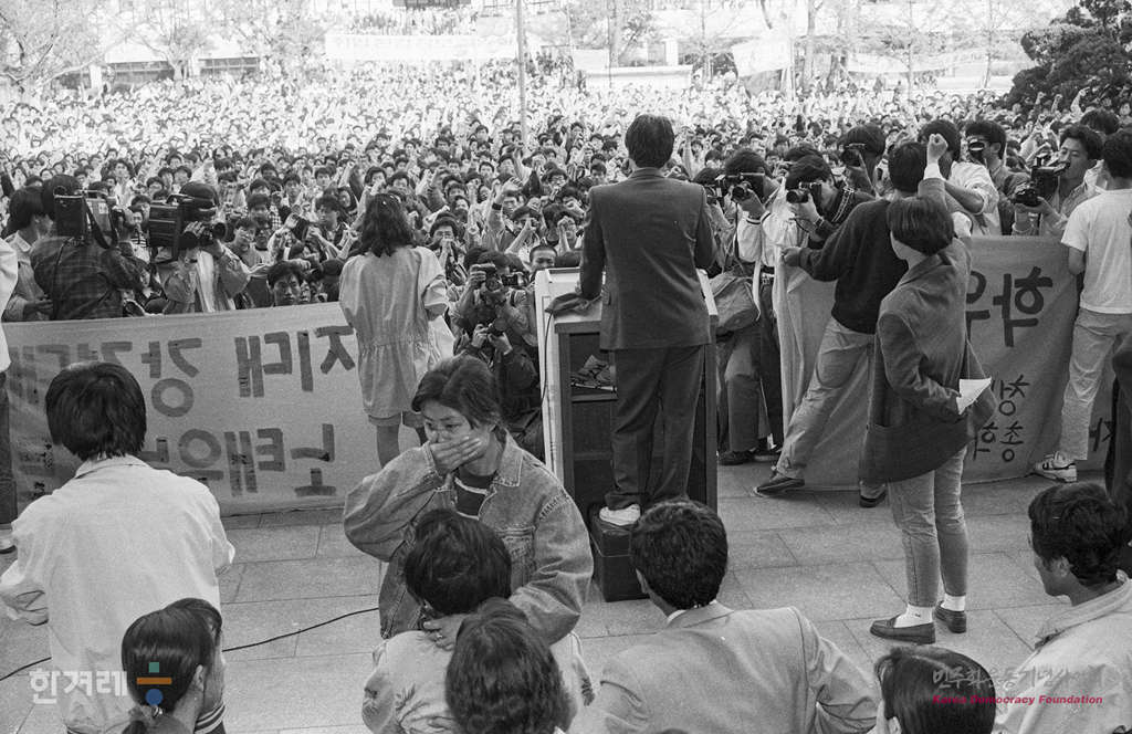 - 1991년 4월 27일 오후3시 고 강경대 열사 추모 및 폭력살인 규탄과 책임자 처벌을 위한 전대협 백만학도 결의대회가 서울 연세대 도서관앞 광장에서 서울지역 대학생 1만여명이 참석한 가운데 열리고 있다. 집회를 마친 학생들은 교문앞으로 진출 신촌로터리까지 거리행진을 하려 했지만 경찰이 물대포와 최루탄을 쏘며 저지하자 연좌농성을 하며 시위를 벌이다 강씨의 조검이 안치된 영안실과 학생회관 등지에서 밤샘농성을 이어갔다.