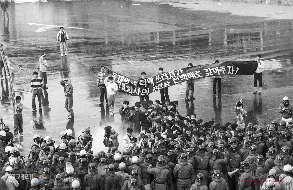 - 1991년 4월 27일 오후3시 고 강경대 열사 추모 및 폭력살인 규탄과 책임자 처벌을 위한 전대협 백만학도 결의대회가 서울 연세대 도서관앞 광장에서 서울지역 대학생 1만여명이 참석한 가운데 열리고 있다. 집회를 마친 학생들은 교문앞으로 진출 신촌로터리까지 거리행진을 하려 했지만 경찰이 물대포와 최루탄을 쏘며 저지하자 연좌농성을 하며 시위를 벌이다 강씨의 조검이 안치된 영안실과 학생회관 등지에서 밤샘농성을 이어갔다.