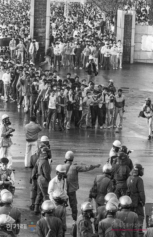 - 1991년 4월 27일 오후3시 고 강경대 열사 추모 및 폭력살인 규탄과 책임자 처벌을 위한 전대협 백만학도 결의대회가 서울 연세대 도서관앞 광장에서 서울지역 대학생 1만여명이 참석한 가운데 열리고 있다. 집회를 마친 학생들은 교문앞으로 진출 신촌로터리까지 거리행진을 하려 했지만 경찰이 물대포와 최루탄을 쏘며 저지하자 연좌농성을 하며 시위를 벌이다 강씨의 조검이 안치된 영안실과 학생회관 등지에서 밤샘농성을 이어갔다.