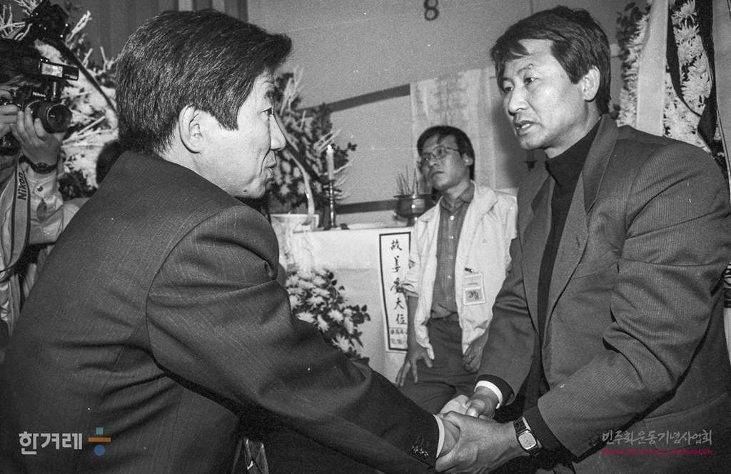 - 1991년 4월 27일 시위진압과정에서 경찰에 의해 숨진 명지대생 강경대씨의 빈소가 마련된 서울 신촌 세브란스병원입구에 노무현의원이 조문을 와 강씨의 아버지 강민조씨와 인사를 나누고 있다