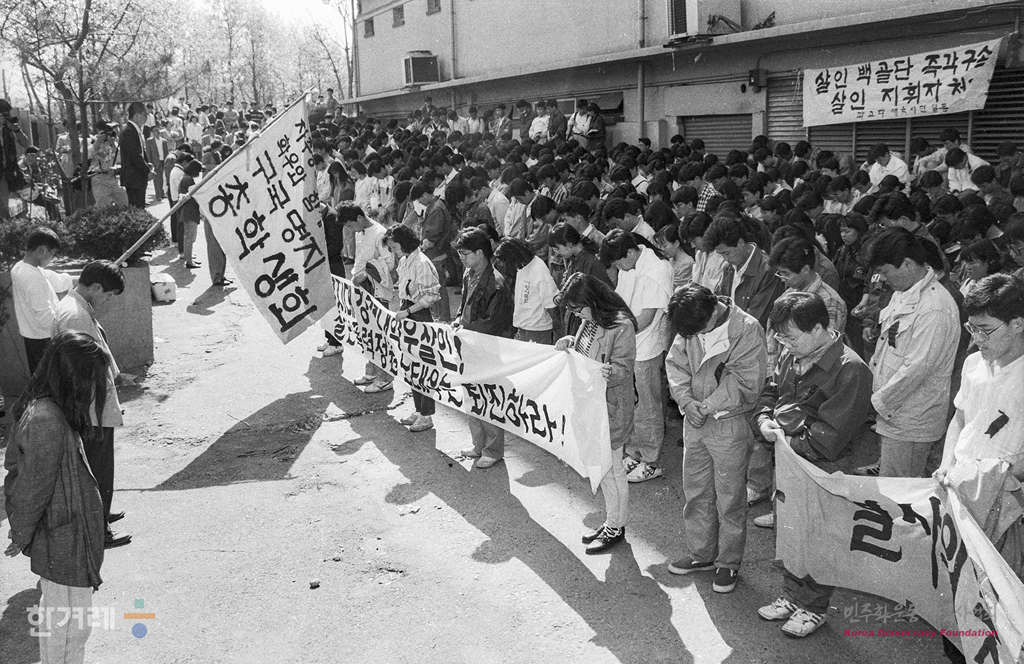 - 1991년 4월 27일 시위진압과정에서 경찰에 의해 숨진 명지대생 강경대씨의 빈소가 마련된 서울 신촌 세브란스병원입구에 각계 인사들의 조문이 잇따르는 가운데 경찰의 침탈을 대비해 전대협 소속 학생들이 영안실 입구를 지키고 있다