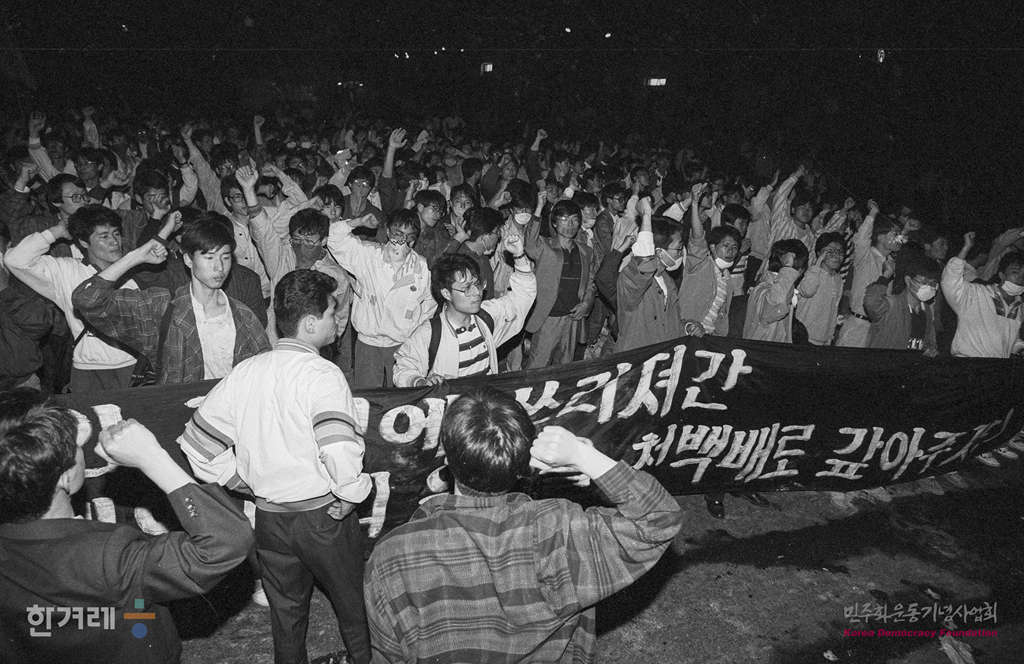 - 1991년 4월 27일 오후3시 고 강경대 열사 추모 및 폭력살인 규탄과 책임자 처벌을 위한 전대협 백만학도 결의대회가 서울 연세대 도서관앞 광장에서 서울지역 대학생 1만여명이 참석한 가운데 열리고 있다. 집회를 마친 학생들은 교문앞으로 진출 신촌로터리까지 거리행진을 하려 했지만 경찰이 물대포와 최루탄을 쏘며 저지하자 연좌농성을 하며 시위를 벌이다 강씨의 조검이 안치된 영안실과 학생회관 등지에서 밤샘농성을 이어갔다.