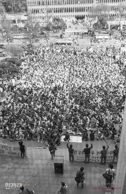 - 1991년 4월 27일 오후3시 고 강경대 열사 추모 및 폭력살인 규탄과 책임자 처벌을 위한 전대협 백만학도 결의대회가 서울 연세대 도서관앞 광장에서 서울지역 대학생 1만여명이 참석한 가운데 열리고 있다. 집회를 마친 학생들은 교문앞으로 진출 신촌로터리까지 거리행진을 하려 했지만 경찰이 물대포와 최루탄을 쏘며 저지하자 연좌농성을 하며 시위를 벌이다 강씨의 조검이 안치된 영안실과 학생회관 등지에서 밤샘농성을 이어갔다.