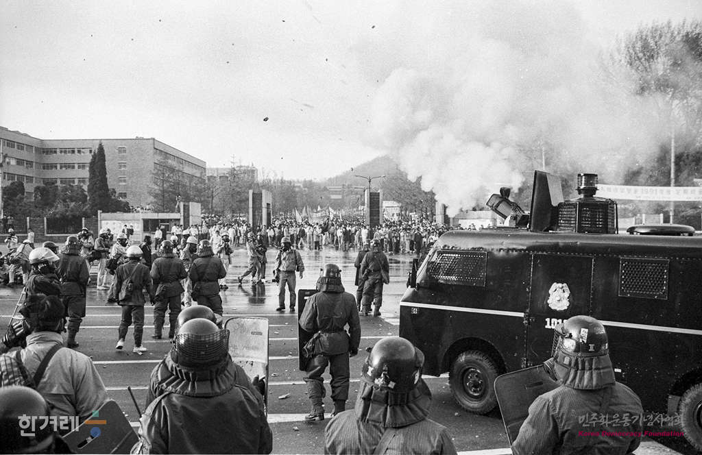 - 1991년 4월 27일 오후3시 고 강경대 열사 추모 및 폭력살인 규탄과 책임자 처벌을 위한 전대협 백만학도 결의대회가 서울 연세대 도서관앞 광장에서 서울지역 대학생 1만여명이 참석한 가운데 열리고 있다. 집회를 마친 학생들은 교문앞으로 진출 신촌로터리까지 거리행진을 하려 했지만 경찰이 물대포와 최루탄을 쏘며 저지하자 연좌농성을 하며 시위를 벌이다 강씨의 조검이 안치된 영안실과 학생회관 등지에서 밤샘농성을 이어갔다.