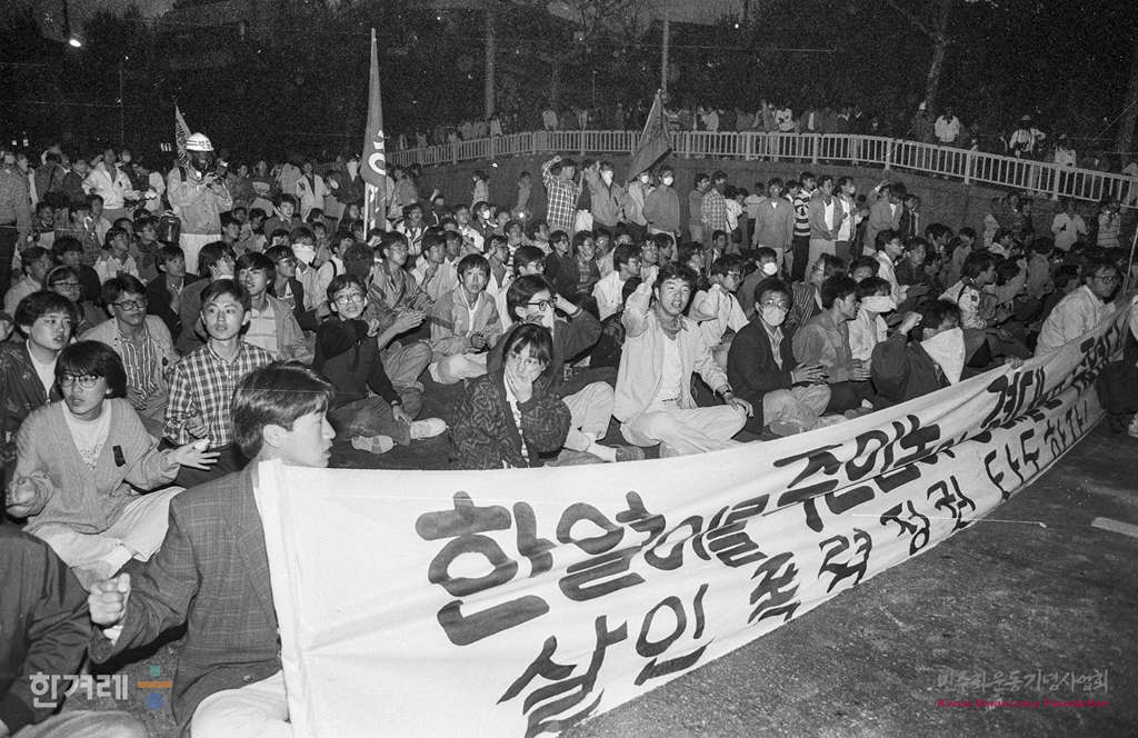 - 1991년 4월 27일 오후3시 고 강경대 열사 추모 및 폭력살인 규탄과 책임자 처벌을 위한 전대협 백만학도 결의대회가 서울 연세대 도서관앞 광장에서 서울지역 대학생 1만여명이 참석한 가운데 열리고 있다. 집회를 마친 학생들은 교문앞으로 진출 신촌로터리까지 거리행진을 하려 했지만 경찰이 물대포와 최루탄을 쏘며 저지하자 연좌농성을 하며 시위를 벌이다 강씨의 조검이 안치된 영안실과 학생회관 등지에서 밤샘농성을 이어갔다.