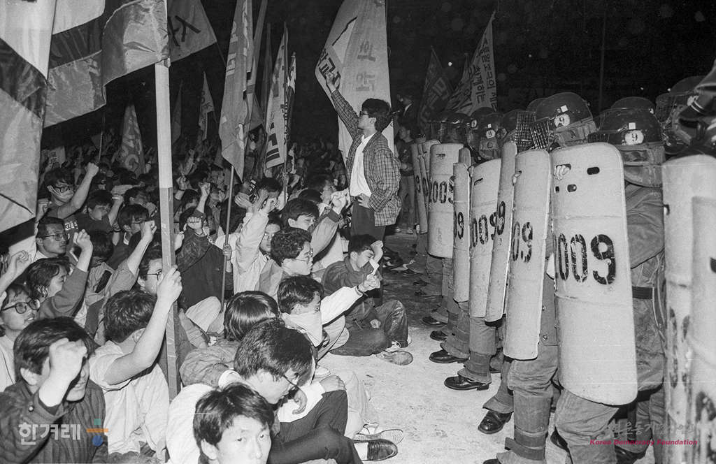 - 1991년 4월 27일 오후3시 고 강경대 열사 추모 및 폭력살인 규탄과 책임자 처벌을 위한 전대협 백만학도 결의대회가 서울 연세대 도서관앞 광장에서 서울지역 대학생 1만여명이 참석한 가운데 열리고 있다. 집회를 마친 학생들은 교문앞으로 진출 신촌로터리까지 거리행진을 하려 했지만 경찰이 물대포와 최루탄을 쏘며 저지하자 연좌농성을 하며 시위를 벌이다 강씨의 조검이 안치된 영안실과 학생회관 등지에서 밤샘농성을 이어갔다.