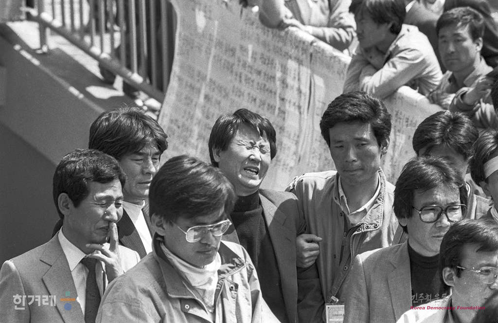 - 1991년 4월 27일 오후3시 고 강경대 열사 추모 및 폭력살인 규탄과 책임자 처벌을 위한 전대협 백만학도 결의대회가 서울 연세대 도서관앞 광장에서 열린 가운데 집회에 참석한 강씨의 아버지 강민조씨와 어머니 이덕순씨씨가 집회도중 울음을 터뜨리고 있다.
