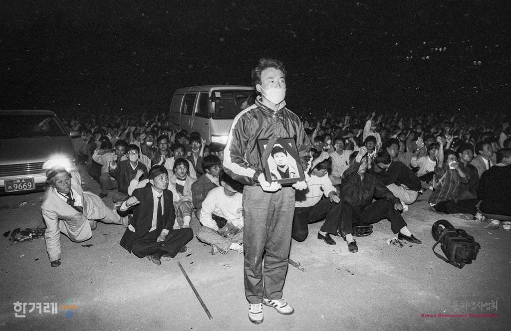 - 1991년 4월 29일 고 강경대 열사 폭력살인 규탄과 공안통치 분쇄를 위한 범국민결의대회가 열린 연세대 대운동장에서 집회를 마친 시위대가 이화여대 입구 지하철역에 재집결해 차선일부와 인도를 점거한 채 시위를 벌이고 있다.
