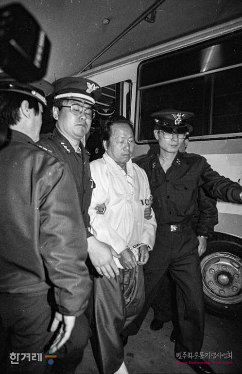 - 1991년 4월 29일 수서특혜 비리사건으로 구속기소된 정태수 한보그룹 회장이 서울형사지법에서 열린 수서비리사건 첫 공판에 출정하기 위해 재판정으로 들어가고 있다.