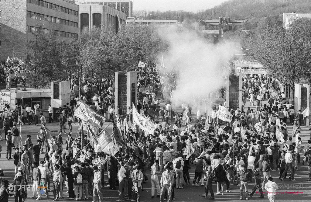 - 1991년 4월 29일 고 강경대열사 폭력살인 규탄과 공안통치 분쇄를 위한 범국민결의대회를 마친 시민 학생들이 교문밖진출을 시도하자 경찰이 최루탄을 쏘며 저지하고 있다.