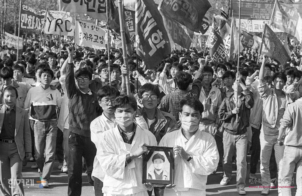 - 1991년 4월 29일 고 강경대 열사 폭력살인 규탄과 공안통치 분쇄를 위한 범국민결의대회가 예정된 서울 연세대에 모인 재야단체 대표들과 시민, 노동자 학생들이 행사를 하기위해 강씨의 영정을 앞세우고 대운동장으로 행진하고 있다.