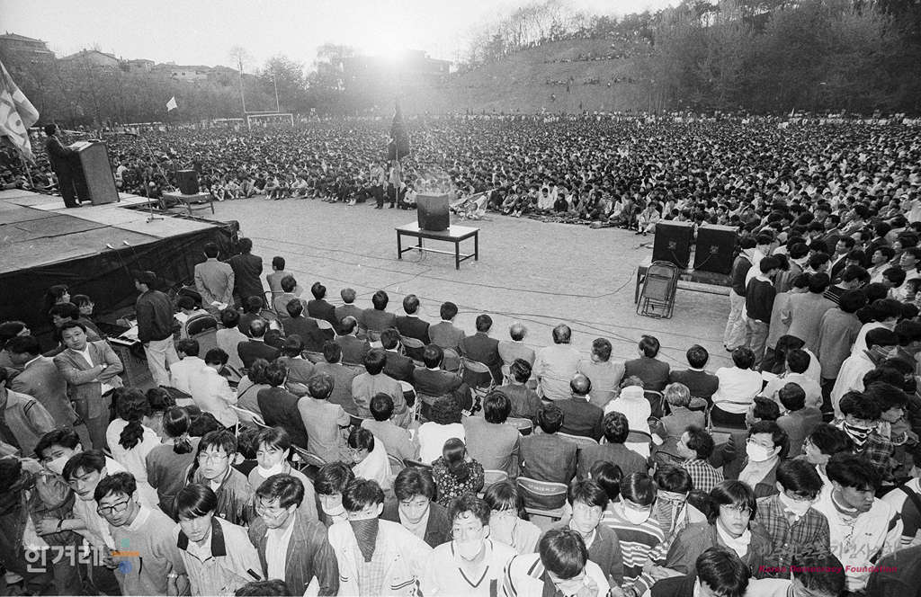 - 1991년 4월 29일 고 강경대 열사 폭력살인 규탄과 공안통치 분쇄를 위한 범국민결의대회가 서울 연세대 대운동장에서 5만여 시민, 학생 노동자 들이 참석한 가운데 집회를 하고 있다.