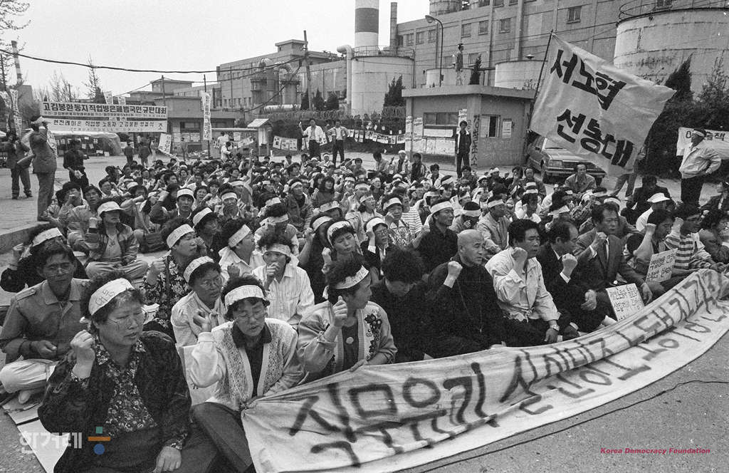 - 1991년 4월 29일 오후2시 이황화탄소 중독환자가 잇따라 발생하는 가운데 직업볍피해 노동자 및 가족들과 인도주의실천의사협의회, 노동과건강연구회 등 보건의료단체 회원들이 경기도 양주군 미금면 도농리 원진레이온 정문에서 범국민산재추방결의대회를 하고 있다.