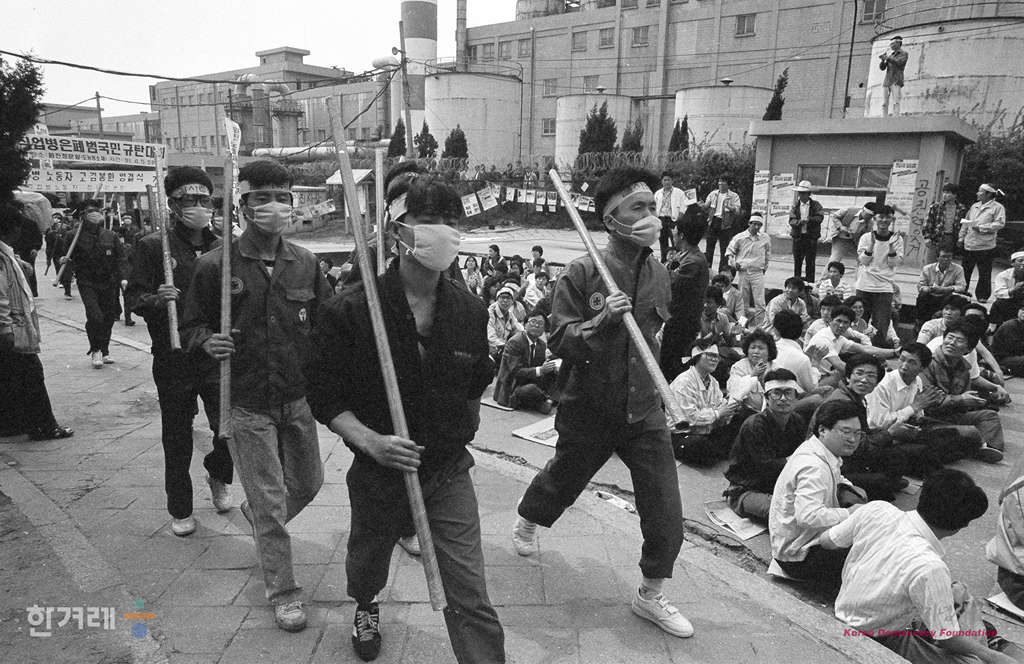 - 1991년 4월 29일 오후2시 이황화탄소 중독환자가 잇따라 발생하는 가운데 직업볍피해 노동자 및 가족들과 인도주의실천의사협의회, 노동과건강연구회 등 보건의료단체 회원들이 경기도 양주군 미금면 도농리 원진레이온 정문에서 범국민산재추방결의대회를 하고 있다.