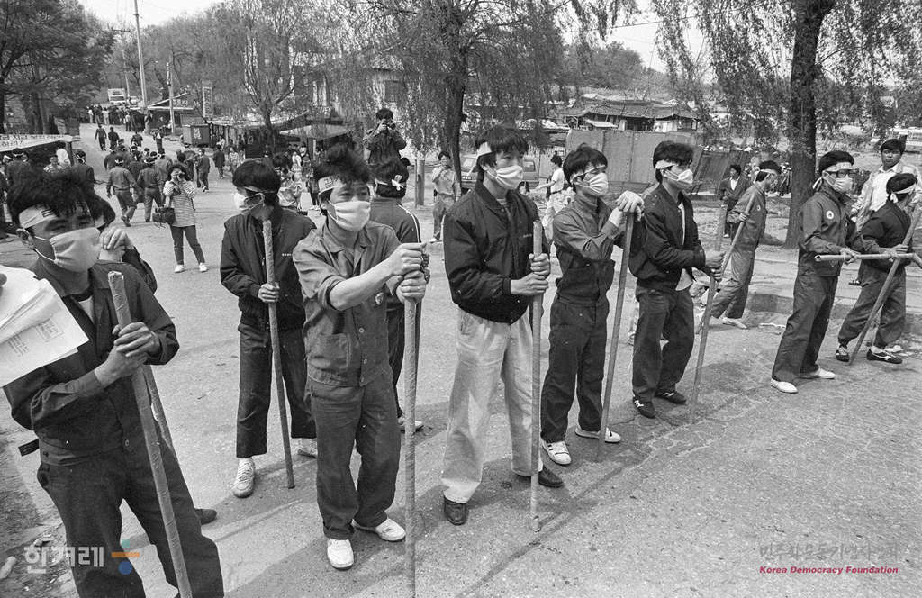 - 1991년 4월 29일 오후2시 이황화탄소 중독환자가 잇따라 발생하는 가운데 직업볍피해 노동자 및 가족들과 인도주의실천의사협의회, 노동과건강연구회 등 보건의료단체 회원들이 경기도 양주군 미금면 도농리 원진레이온 정문에서 범국민산재추방결의대회를 하고 있다.