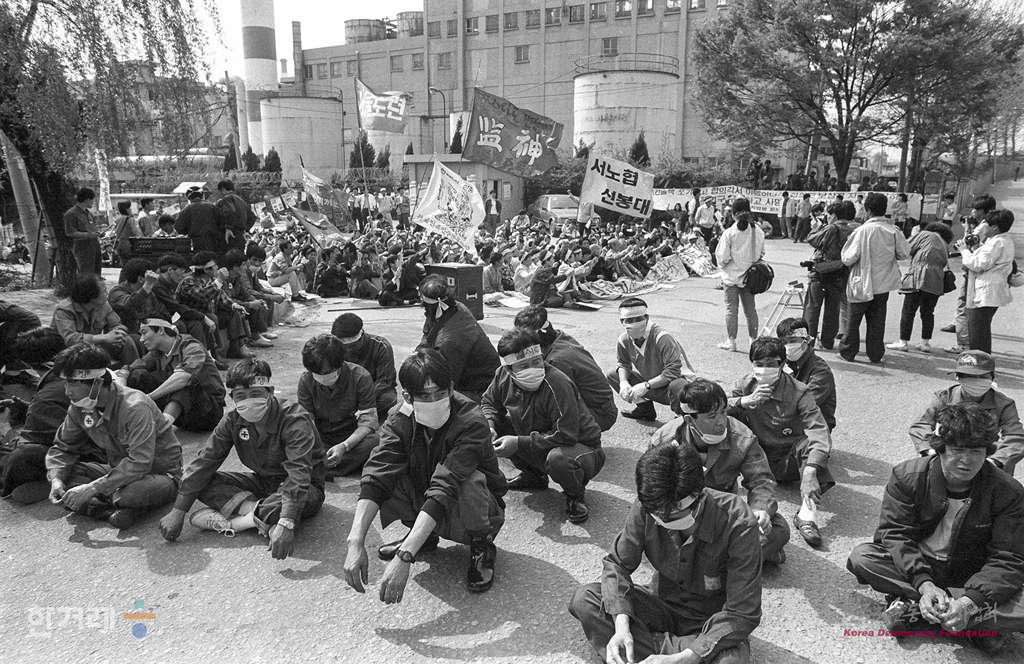 - 1991년 4월 29일 오후2시 이황화탄소 중독환자가 잇따라 발생하는 가운데 직업볍피해 노동자 및 가족들과 인도주의실천의사협의회, 노동과건강연구회 등 보건의료단체 회원들이 경기도 양주군 미금면 도농리 원진레이온 정문에서 범국민산재추방결의대회를 하고 있다.