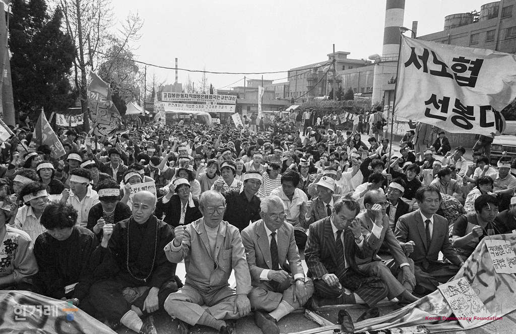 - 1991년 4월 29일 오후2시 이황화탄소 중독환자가 잇따라 발생하는 가운데 직업볍피해 노동자 및 가족들과 인도주의실천의사협의회, 노동과건강연구회 등 보건의료단체 회원들이 경기도 양주군 미금면 도농리 원진레이온 정문에서 범국민산재추방결의대회를 하고 있다.
