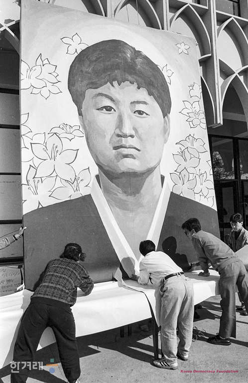 - 1991년 4월 29일 고 강경대 열사 폭력살인 규탄과 공안통치 분쇄를 위한 범국민결의대회를 앞두고 학생들이 연세대 학생회관앞에 행사 참가자들이 조문할 강경대열사 분향소를 마련하고 있다.