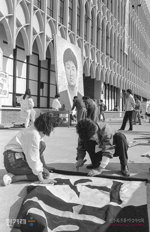 - 1991년 4월 29일 고 강경대 열사 폭력살인 규탄과 공안통치 분쇄를 위한 범국민결의대회를 앞두고 학생들이 연세대 학생회관앞에 행사 참가자들이 조문할 강경대열사 분향소를 마련하고 있다.