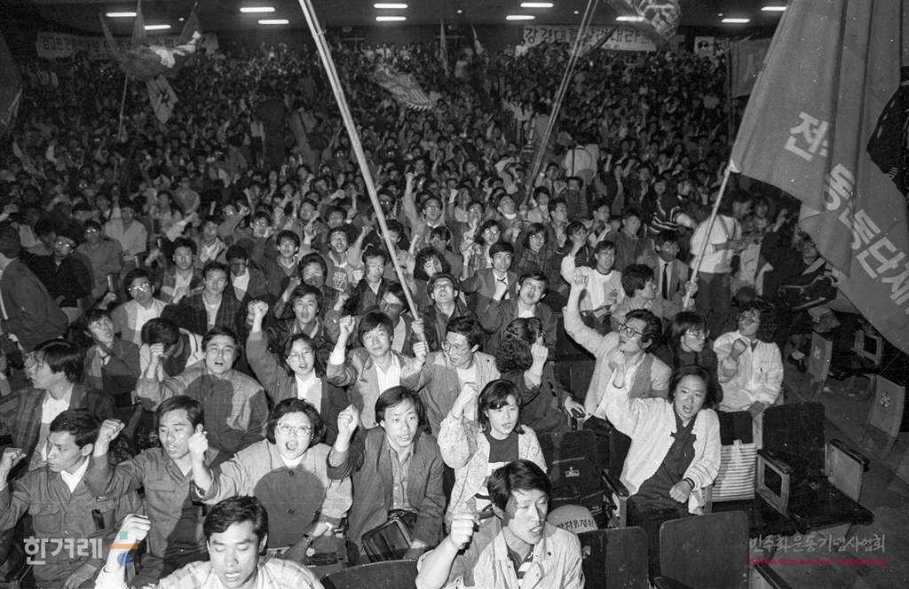 - 1991년 4월 30일 세계노동절 102돌 기념대회를 앞두고 대규모 노동절 연대집회를 준비되는 가운데 서울지역노동조합협의회 소속 노동자들이 서울 연세대 대강당에서 전야제를 갖고 있다.