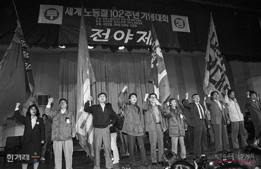 - 1991년 4월 30일 세계노동절 102돌 기념대회를 앞두고 대규모 노동절 연대집회를 준비되는 가운데 서울지역노동조합협의회 소속 노동자들이 서울 연세대 대강당에서 전야제를 갖고 있다.