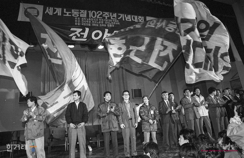 - 1991년 4월 30일 세계노동절 102돌 기념대회를 앞두고 대규모 노동절 연대집회를 준비되는 가운데 서울지역노동조합협의회 소속 노동자들이 서울 연세대 대강당에서 전야제를 갖고 있다.