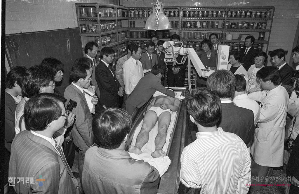 - 1991년 5월 1일 오후 5시 15분 명지대생 고 강경대씨의 주검에 대한 검찰과 유가족과 대책회의쪽의 공동검안이 강씨의 죽음 닷새만에 세브란스병원 검안실에서 실시되고 있다. 이날 검안에는 검찰쪽에서 서울지검 서부지청 형사2부 정현태 이학성 두 검사와 서울대 의대 이정빈 이윤성교수 등 4명이 참석했고 유족과 대책회의쪽에서는 아버지 강민조씨와 어머니, 누나, 양길승 성수의원 원장, 변박장 순천향병원 정형외과 의사 등 4명을 비롯한 양쪽 관계자 30여명이 참석했다.