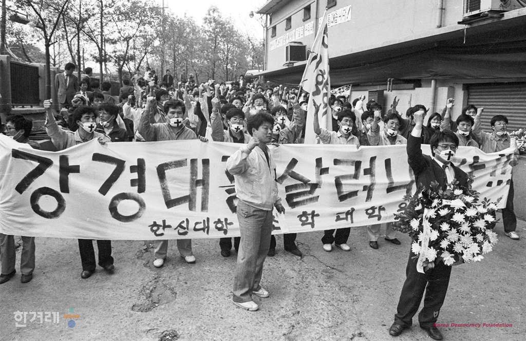 - 1991년 5월 1일 오후 5시 15분 명지대생 고 강경대씨의 주검에 대한 검찰과 유가족과 대책회의쪽의 공동검안이 강씨의 죽음 닷새만에 세브란스병원 검안실에서 실시되고 있는 가운데 영안실 밖에 한신대 신학대학원생들이 조문을 기다리며 구호를 외치고 있다.