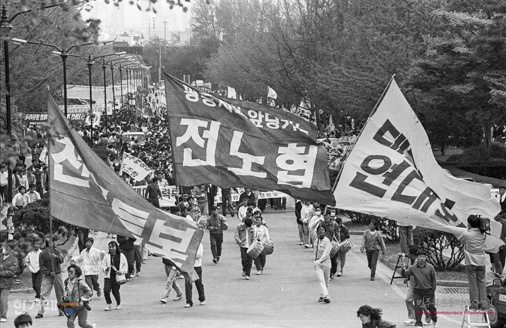 - 1991년 5월 1일 세계 노동절 102돌 기념대회를 서울 연세대 노천극장에서 마친 참가자들이 바로 이어서 민주광장으로 이동해 원진레이온 직업볍 살인 및 고 강경대 열사 폭력살인 규탄대회를 가졌다. 참석한 2만여명의 노동자 학생들은 공안통치종식과 노동운동 탄압중지를 요구하며 구호를 외쳤다.