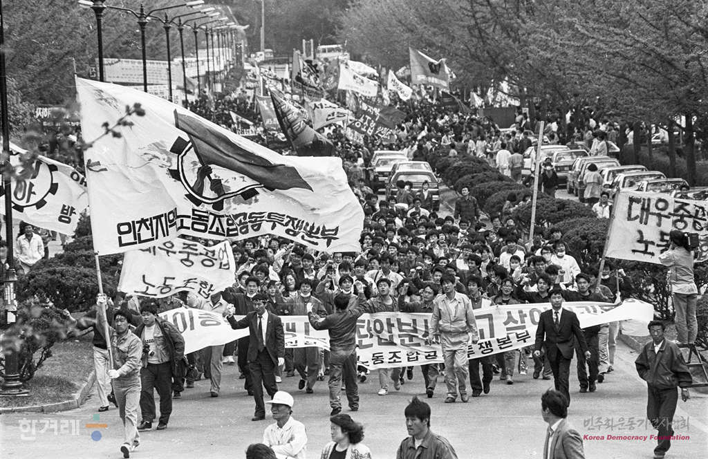 - 1991년 5월 1일 세계 노동절 102돌 기념대회를 서울 연세대 노천극장에서 마친 참가자들이 바로 이어서 민주광장으로 이동해 원진레이온 직업볍 살인 및 고 강경대 열사 폭력살인 규탄대회를 가졌다. 참석한 2만여명의 노동자 학생들은 공안통치종식과 노동운동 탄압중지를 요구하며 구호를 외쳤다.