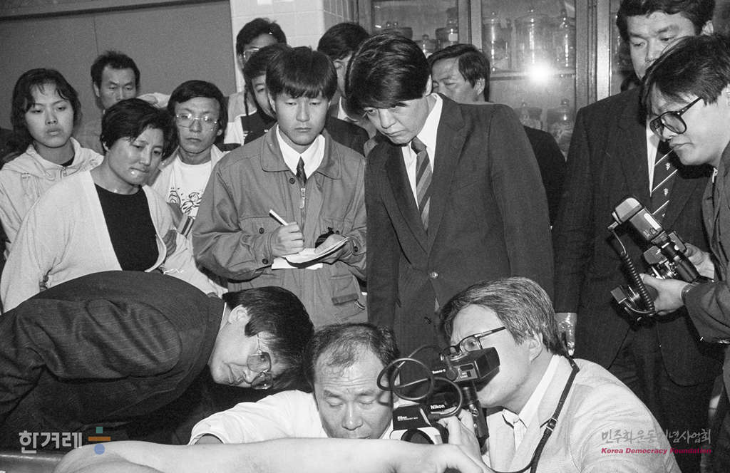 - 1991년 5월 1일 오후 5시 15분 명지대생 고 강경대씨의 주검에 대한 검찰과 유가족과 대책회의쪽의 공동검안이 강씨의 죽음 닷새만에 세브란스병원 검안실에서 실시되고 있다. 이날 검안에는 검찰쪽에서 서울지검 서부지청 형사2부 정현태 이학성 두 검사와 서울대 의대 이정빈 이윤성교수 등 4명이 참석했고 유족과 대책회의쪽에서는 아버지 강민조씨와 어머니, 누나, 양길승 성수의원 원장, 변박장 순천향병원 정형외과 의사 등 4명을 비롯한 양쪽 관계자 30여명이 참석했다.
