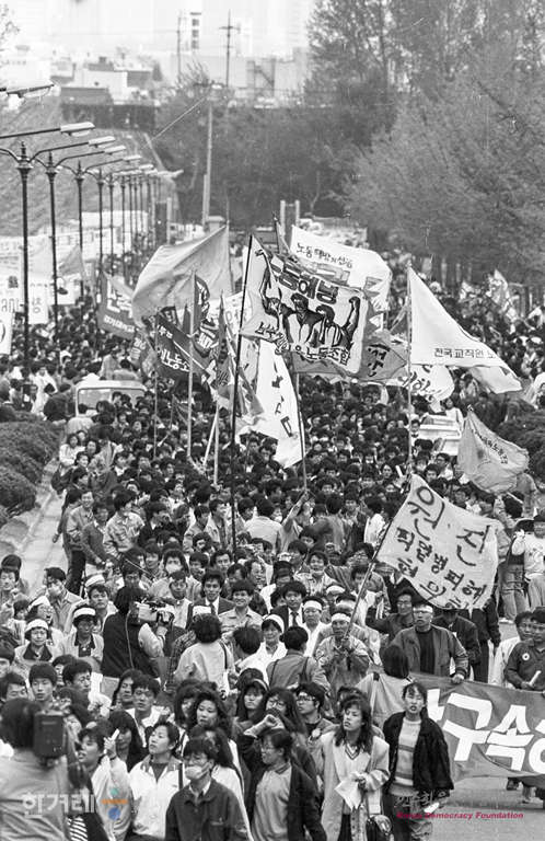 - 1991년 5월 1일 세계 노동절 102돌 기념대회와 원진레이온 직업볍 살인 및 고 강경대 열사 폭력살인 규탄대회가 열린 연세대 노천극장으로 2만여명의 노동자 학생들이 구호를 외치며 행진을 하고 있다.