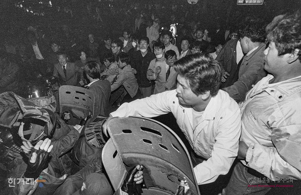 - 1991년 5월 1일 세계 노동절 102돌 기념대회와 원진레이온 직업볍 살인 및 고 강경대 열사 폭력살인 규탄대회가 열린 연세대 노천극장에서 마친 노동자 학생들이 명동성당 앞에서 평화적인 시위를 하던 중 경찰에 의해 강제해산되고 있다.