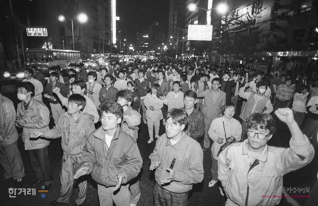- 1991년 5월 1일 세계 노동절 102돌 기념대회와 원진레이온 직업볍 살인 및 고 강경대 열사 폭력살인 규탄대회가 열린 연세대 노천극장에서 마친 노동자 학생들이 명동성당 앞에서 평화적인 시위를 하던 중 경찰에 의해 강제해산되고 있다.