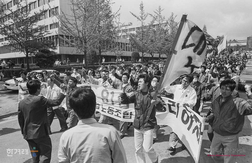 - 1991년 5월 1일 세계 노동절 102돌 기념대회를 서울 연세대 노천극장에서 마친 참가자들이 바로 이어서 민주광장으로 이동해 원진레이온 직업볍 살인 및 고 강경대 열사 폭력살인 규탄대회를 가졌다. 참석한 2만여명의 노동자 학생들은 공안통치종식과 노동운동 탄압중지를 요구하며 구호를 외쳤다.