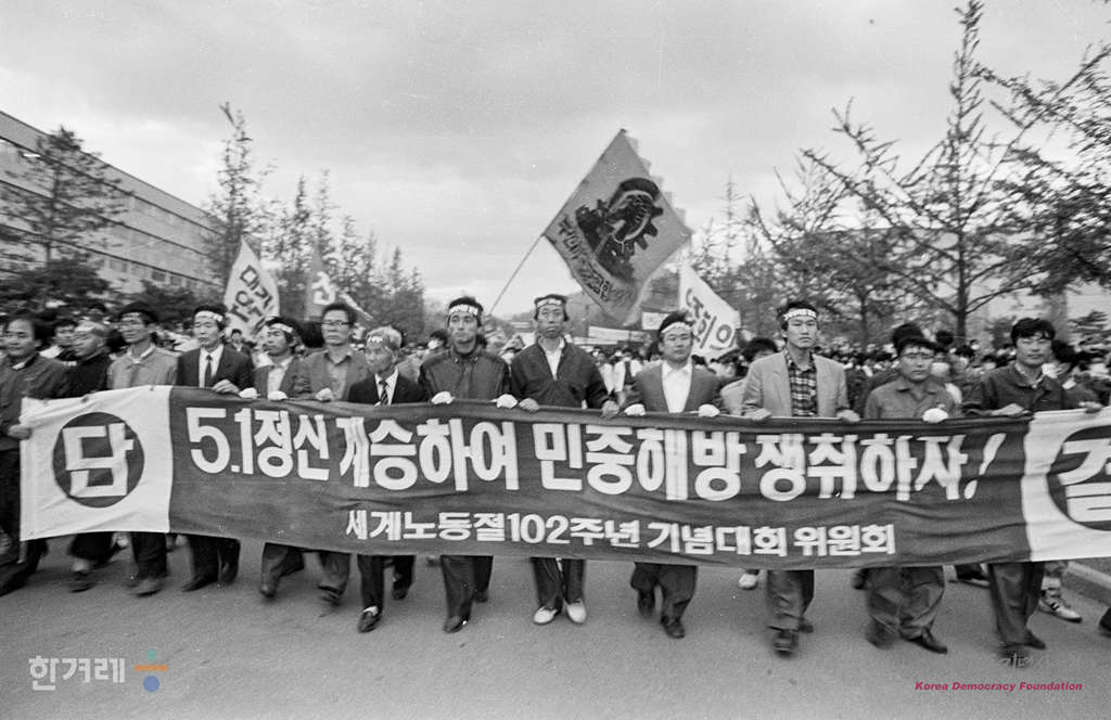 - 1991년 5월 1일 세계 노동절 102돌 기념대회와 원진레이온 직업볍 살인 및 고 강경대 열사 폭력살인 규탄대회가 열린 연세대 노천극장에서 행사를 마친 참석자들이 교문쪽으로 행진을 하고 있다.