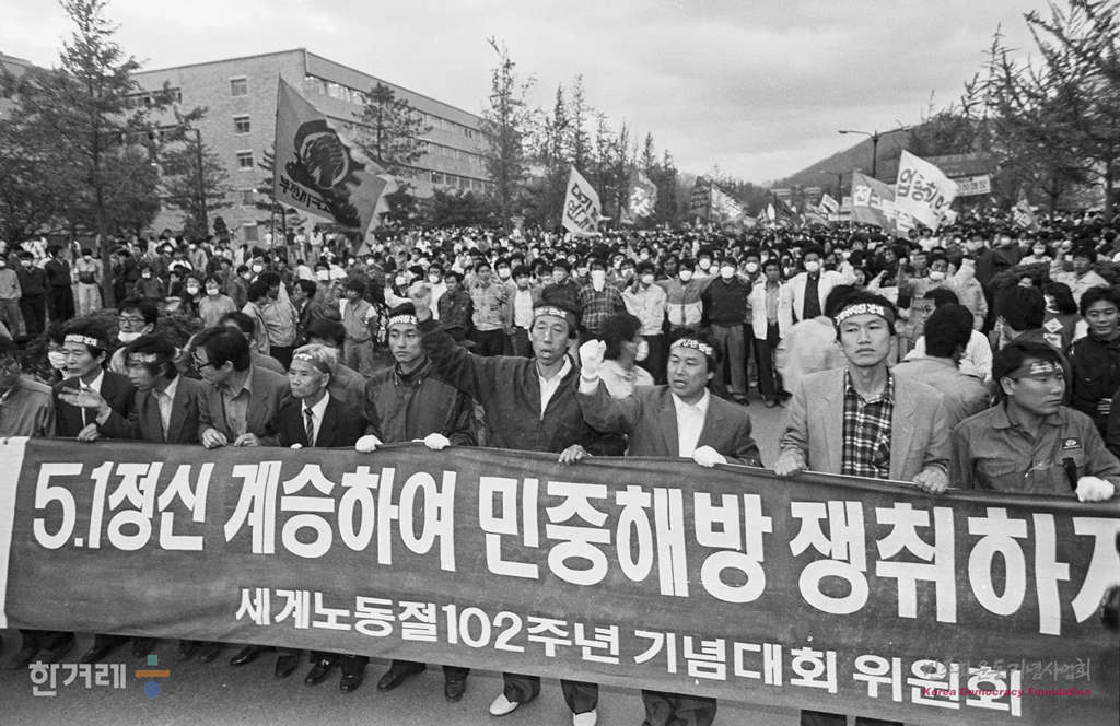 - 1991년 5월 1일 세계 노동절 102돌 기념대회와 원진레이온 직업볍 살인 및 고 강경대 열사 폭력살인 규탄대회가 열린 연세대 노천극장에서 행사를 마친 참석자들이 교문쪽으로 행진을 하고 있다.