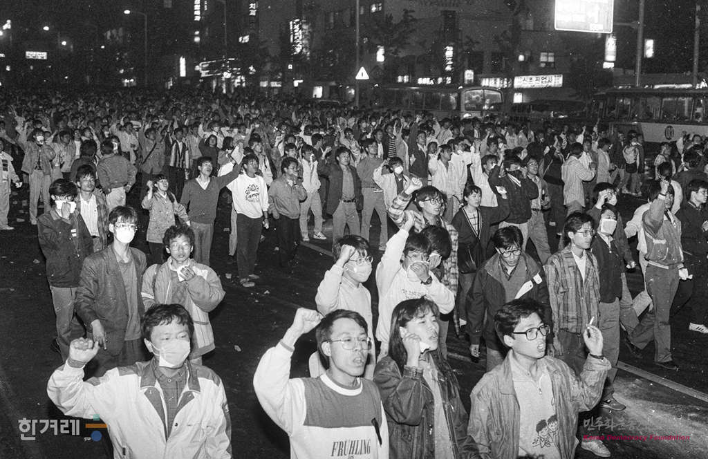- 1991년 5월 1일 세계 노동절 102돌 기념대회와 원진레이온 직업볍 살인 및 고 강경대 열사 폭력살인 규탄대회가 열린 연세대 노천극장에서 마친 노동자 학생들이 명동성당 앞에서 평화적인 시위를 하던 중 경찰에 의해 강제해산되고 있다.