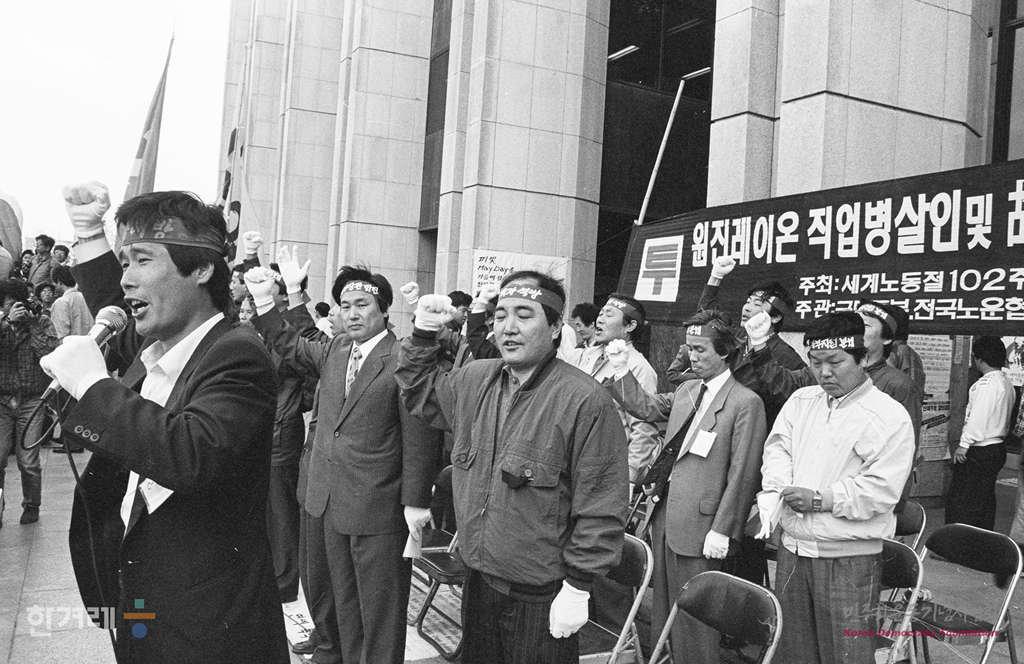 - 1991년 5월 1일 세계 노동절 102돌 기념대회를 서울 연세대 노천극장에서 마친 참가자들이 바로 이어서 민주광장으로 이동해 원진레이온 직업볍 살인 및 고 강경대 열사 폭력살인 규탄대회를 가졌다. 참석한 2만여명의 노동자 학생들은 공안통치종식과 노동운동 탄압중지를 요구하며 구호를 외쳤다.