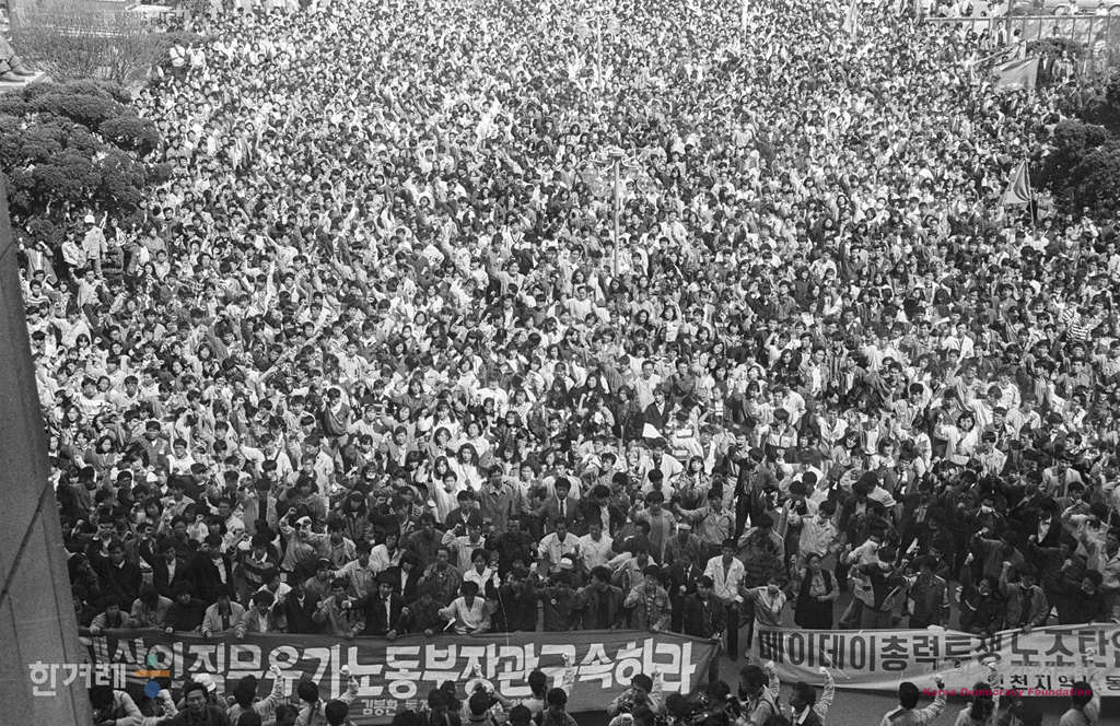 - 1991년 5월 1일 세계 노동절 102돌 기념대회를 서울 연세대 노천극장에서 마친 참가자들이 바로 이어서 민주광장으로 이동해 원진레이온 직업볍 살인 및 고 강경대 열사 폭력살인 규탄대회를 가졌다. 참석한 2만여명의 노동자 학생들은 공안통치종식과 노동운동 탄압중지를 요구하며 구호를 외쳤다.