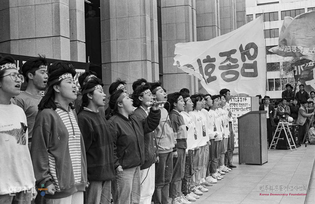- 1991년 5월 1일 세계 노동절 102돌 기념대회를 서울 연세대 노천극장에서 마친 참가자들이 바로 이어서 민주광장으로 이동해 원진레이온 직업볍 살인 및 고 강경대 열사 폭력살인 규탄대회를 가졌다. 참석한 2만여명의 노동자 학생들은 공안통치종식과 노동운동 탄압중지를 요구하며 구호를 외쳤다.