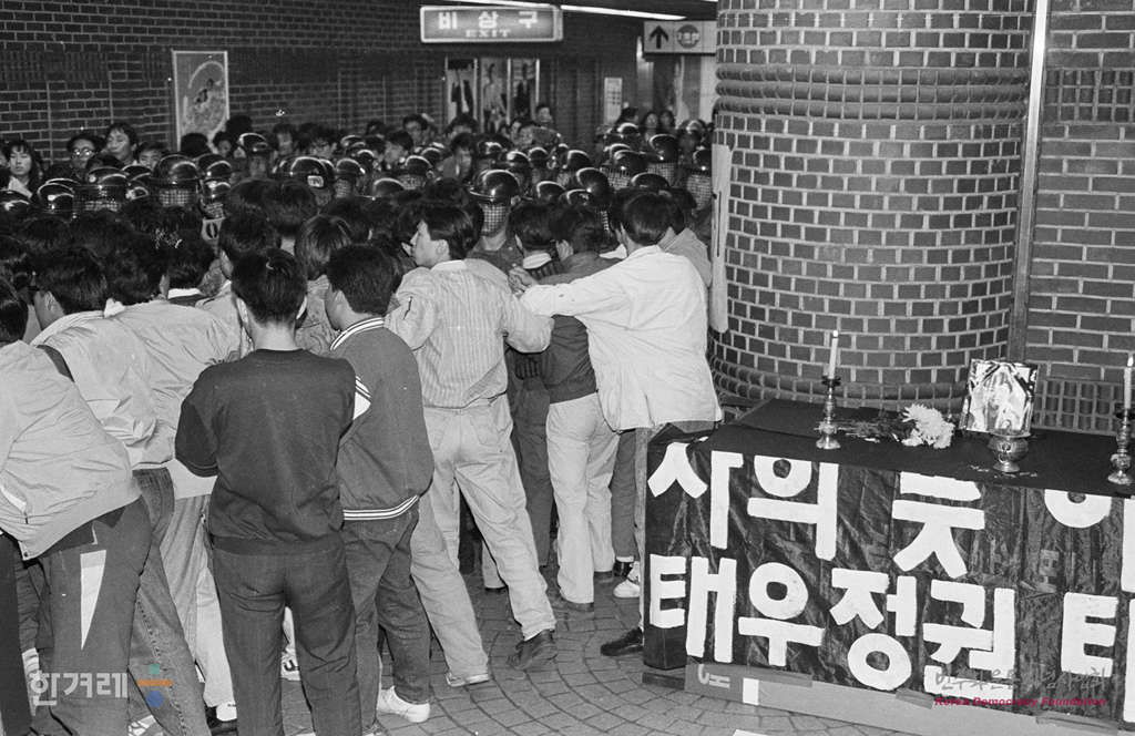 - 1991년 5월 1일 세계 노동절 102돌 기념대회를 참석하기 위해 서울 연세대를 찾은 노동자들이 강경대열사 영안실이 마련된 연세 세브란스 병원 장례식장에 줄을 지어 조문을 하고 있다.