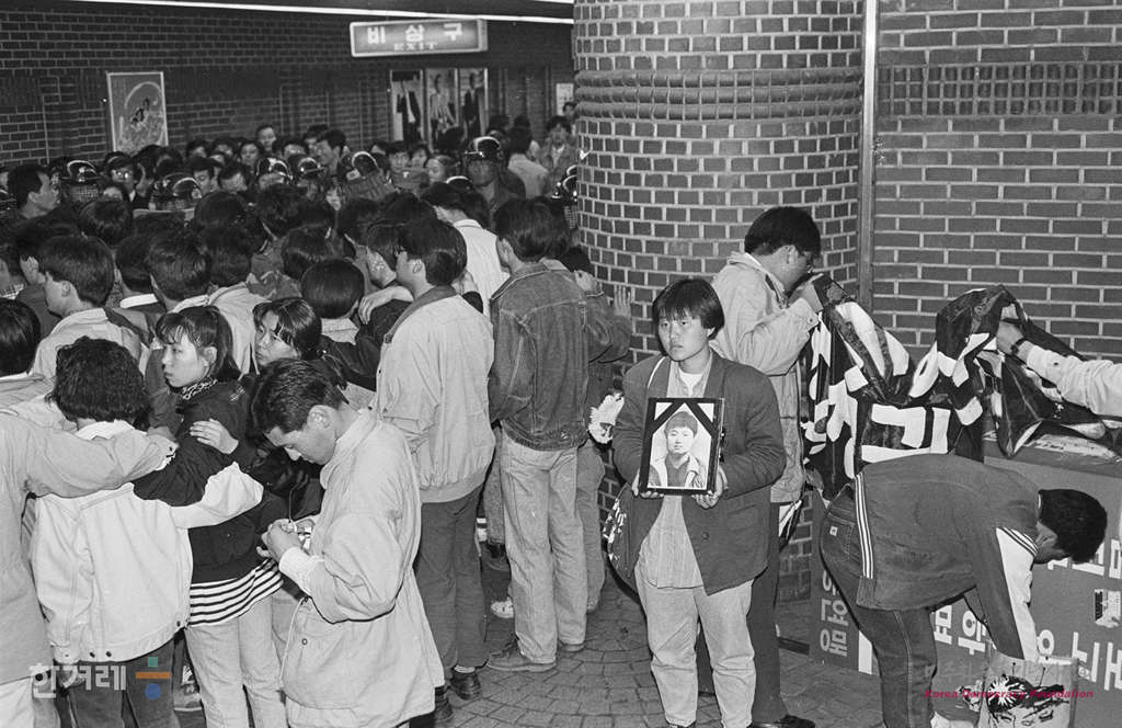 - 1991년 5월 2일 명지대생들이 서울 시청 지하철역 구내에 설치한 고 강경대씨 분향소에서 시민들이 강씨의 명복을 빌려 조문을 하고 있다.
