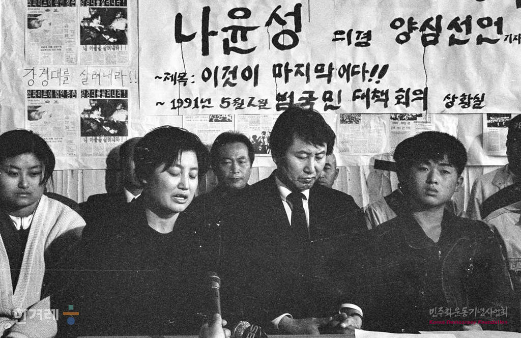 - 1991년 5월 2일 강경대 죽음 이후 전투경찰의 폭력성에 회의를 느껴 부대를 이탈한 뒤 서울 연세대 학생회관에서 서울시 경찰국 제2동대 소속 나윤성 의경이 양심선언을 하자 고 강경대씨의 아버지 강민조씨가 나의경을 껴안고 격려를 하고 있다.
