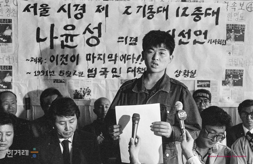 - 1991년 5월 2일 강경대 죽음 이후 전투경찰의 폭력성에 회의를 느껴 부대를 이탈한 뒤 서울 연세대 학생회관에서 서울시 경찰국 제2동대 소속 나윤성 의경이 양심선언을 하자 고 강경대씨의 아버지 강민조씨가 나의경을 껴안고 격려를 하고 있다.